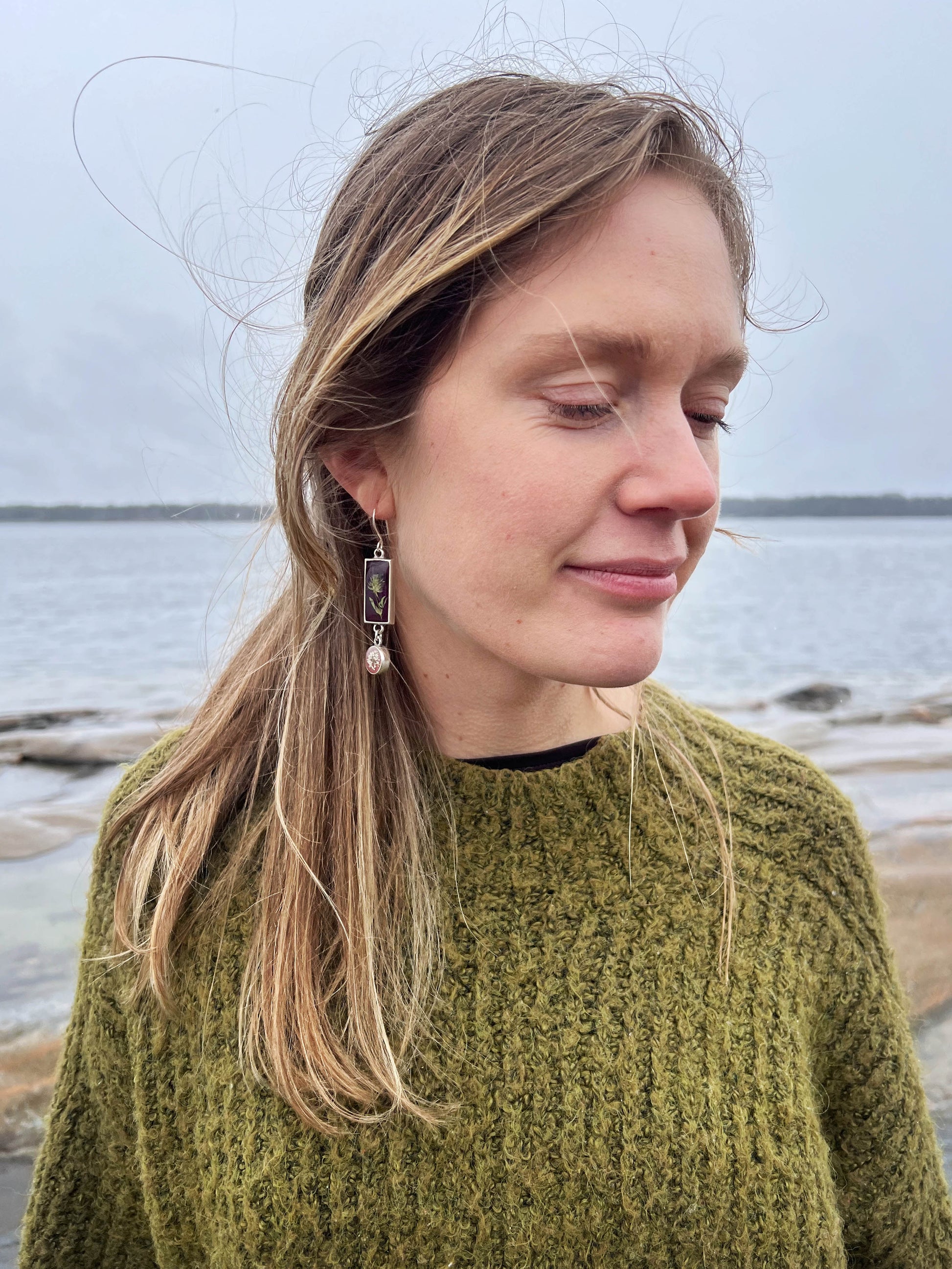 These earrings are made with real Rabbit’s foot clover and Queen Anne’s lace, known as Hartassklöver and Hundkex in Swedish (Trifolium arvense and Daucus carota), carefully handpicked in wild summer meadows and set against deep purple and dusty rose backgrounds.