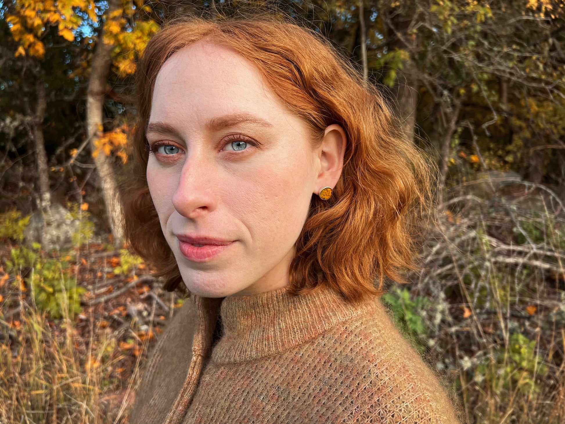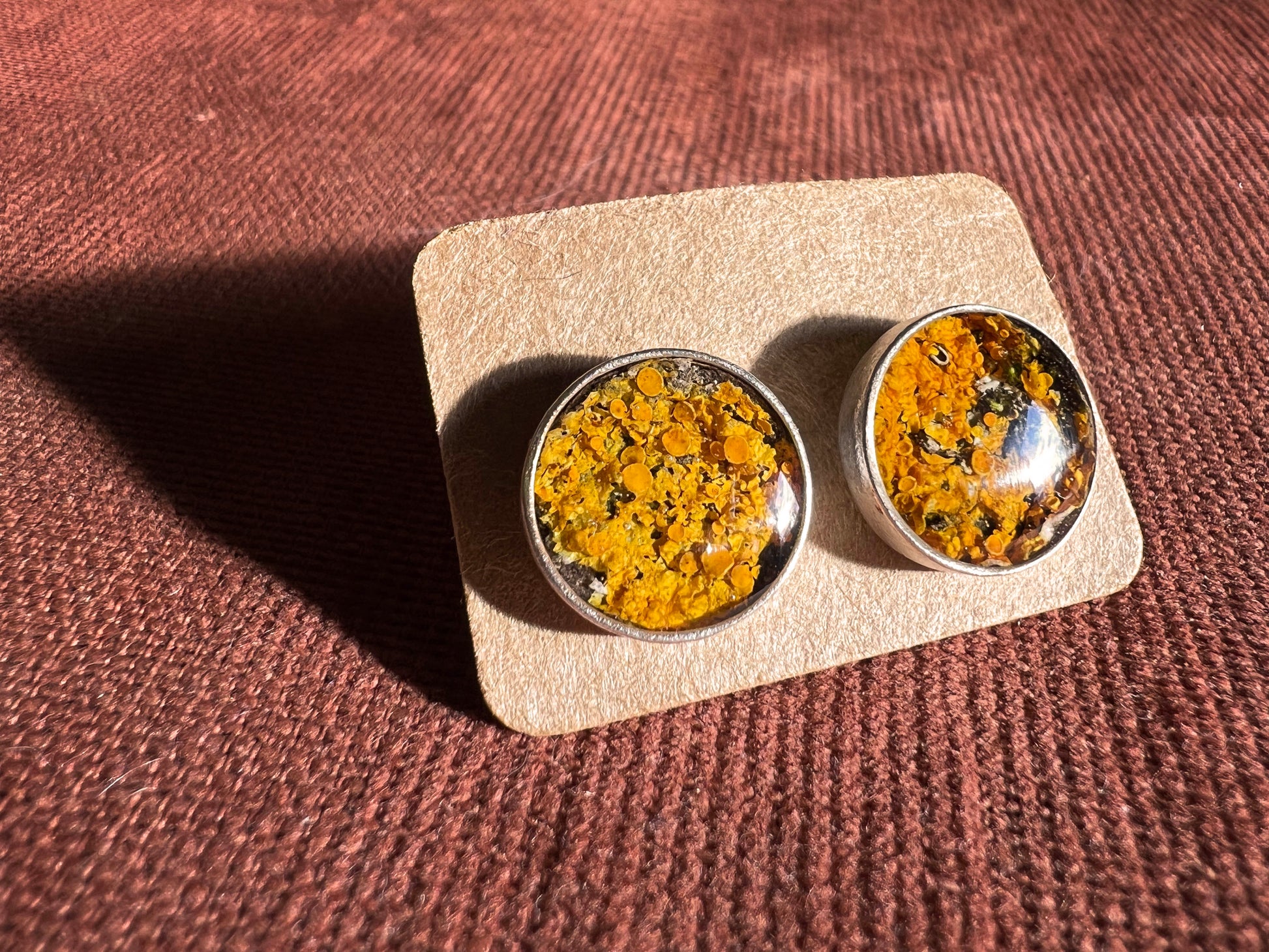 These earrings are made with real yellow wall lichen, collected from fallen branches in the forest and carefully preserved by hand. The warm golden tones bring a subtle glow and a sense of the woods to any outfit.