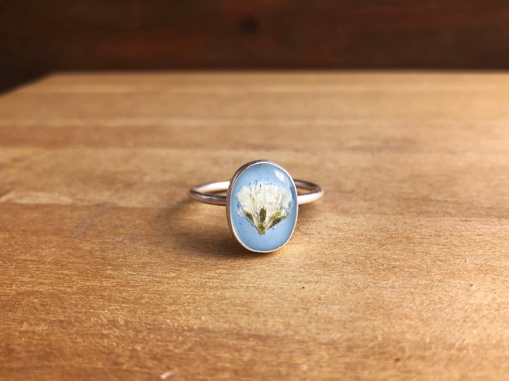 These beautiful rings are handmade with a base in a soft pastel blue color and decorated with pressed Baby's Breath flowers.