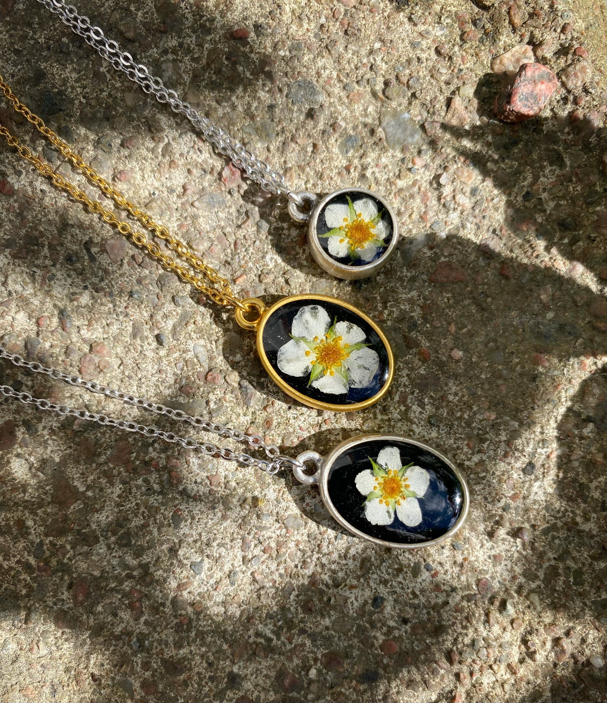 SMULTRON - Small round necklace with a real Smultron flower (Wild Strawberry flower in Swedish)