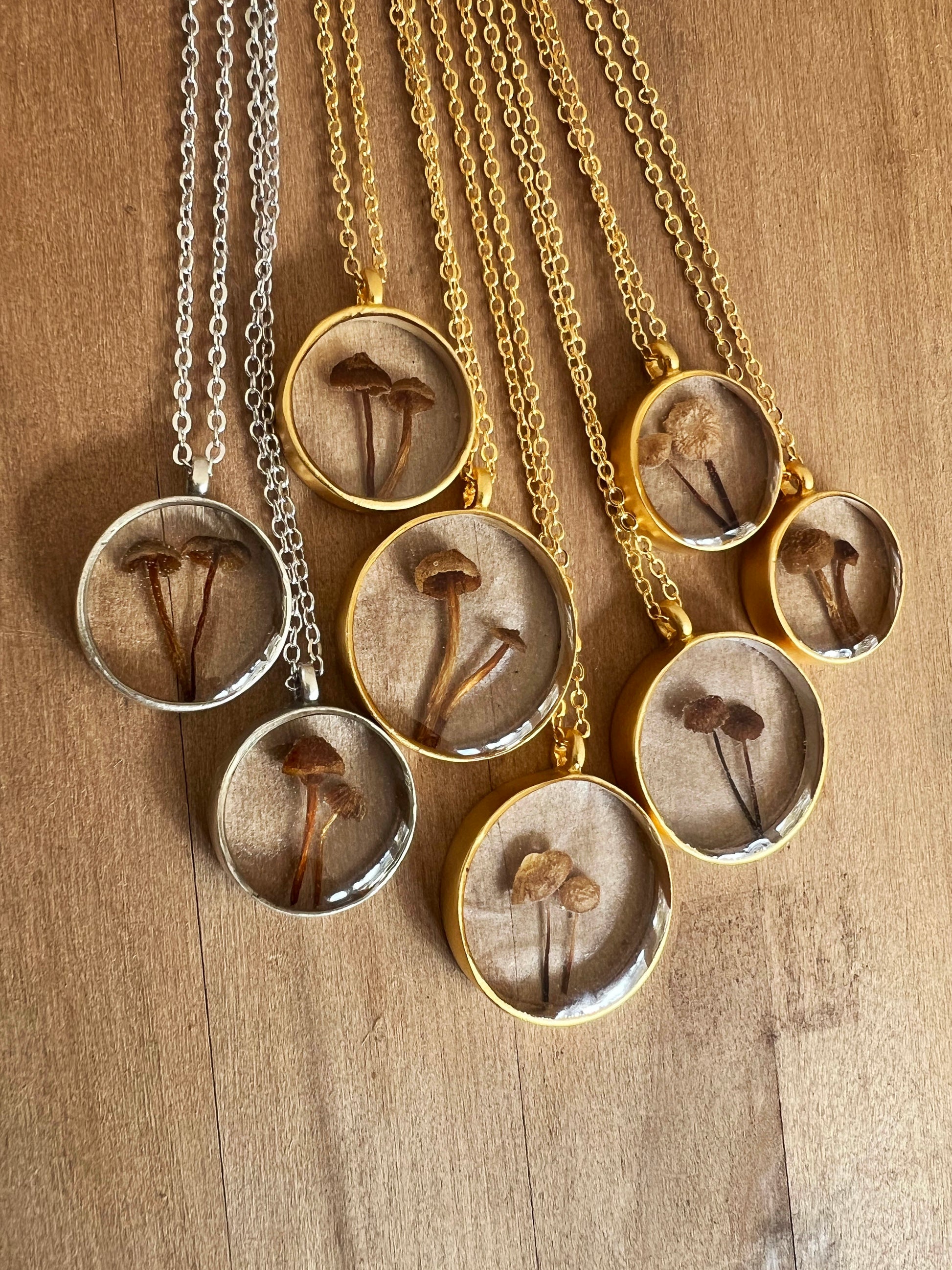 Beautiful necklaces in silver and gold made with real Tiny Forest Mushrooms, carefully handpicked from the woods just behind my little cabin.